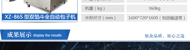 XZ-86S型雙餡斗全自動(dòng)包子機(jī),可生產(chǎn)各種肉包、肉菜包、菜包、小籠包、湯包、水晶包、圓饅頭、奶黃包、豆沙包、叉燒包、南瓜餅等幾十種包餡制品。適用于賓館、飯店、學(xué)校、機(jī)關(guān)企業(yè)食堂、饅頭或包子加工廠、早餐工程店及速凍食品廠等單位??蓾M足不同客戶(hù)群體。免費(fèi)提供工藝技術(shù)。免費(fèi)上門(mén)培訓(xùn)指導(dǎo)安裝。