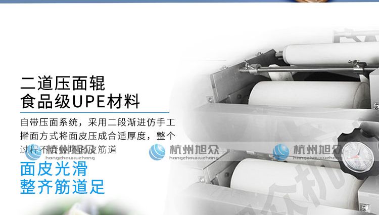 ◆壓面滾筒采用性能更好的食品級(jí)材料UPE加工而成,且增大了滾筒直徑使得在壓面過程中面皮的精度更高,產(chǎn)品重量精度更高;