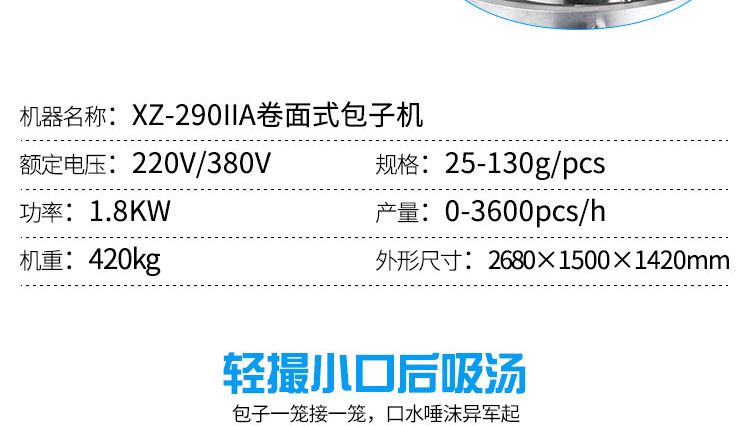 XZ-290IIA卷面式包子機(jī),可生產(chǎn)肉包、菜包、小籠包、豆沙包、奶黃包、云南破酥包等多種包餡類產(chǎn)品。適用于賓館、飯店、學(xué)校、機(jī)關(guān)企業(yè)食堂、饅頭或包子加工廠、早餐工程店及速凍食品廠等單位??蓾M足不同客戶群體。免費(fèi)提供工藝技術(shù)。免費(fèi)上門培訓(xùn)指導(dǎo)安裝。