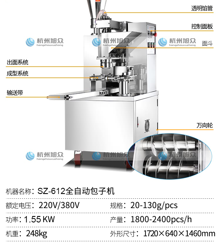 SZ-612全自動包子機,22800元(不含運費不含稅價格),SZ-612型全自動包子機是一款設計先進,結構簡單,操作方便,生產(chǎn)性能穩(wěn)定的設備。其體積小重量輕,外殼主要部件采用不銹鋼制作,外觀精美。