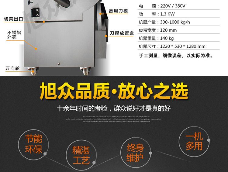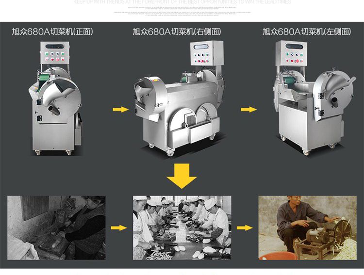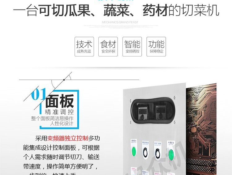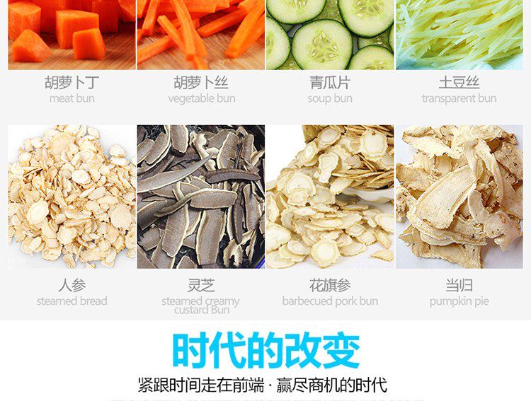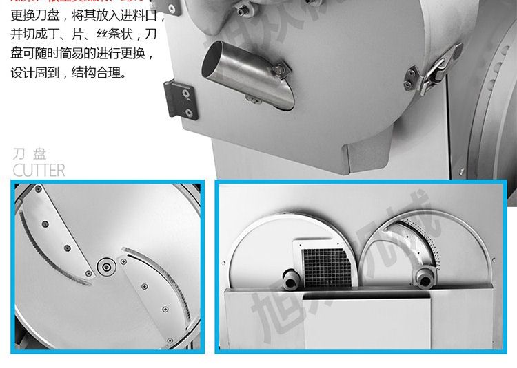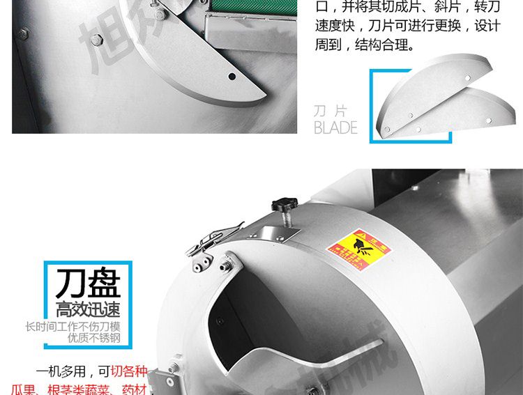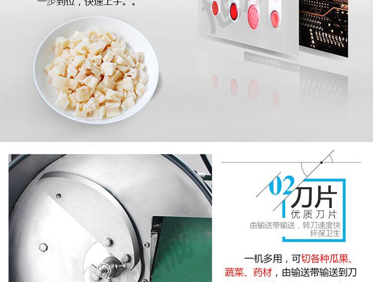 一機(jī)多用,可切葉菜及根莖類蔬菜,并可切片、絲、條、丁、段,碎等;根莖類,成品形狀:片、四角絲條、丁、斜片;葉菜類,切割尺寸:1-30mm可以調(diào)整。