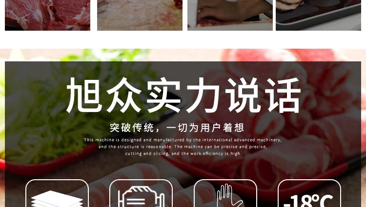 5.旭眾牛羊肉切片機(jī)憑借其外觀,高效率加工能力,簡單的操作,及超低的故障率,備受廣大客戶的好評,成型美觀