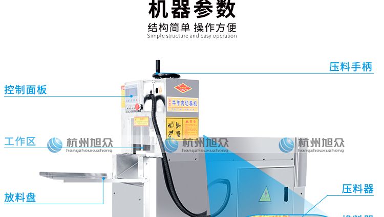 3.本設(shè)備采用電動推料、電動調(diào)節(jié)厚度、肉料加工完畢切刀自動停止,推料板自動后退、自動停止