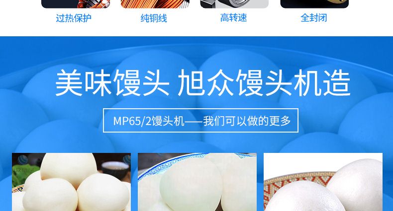 MP65/2型饅頭機(jī),可生產(chǎn)各種饅頭、圓饅頭、光頭饅頭、饃饃等面制品。適用于個(gè)體戶(hù)、食品廠、學(xué)校等單位食堂。可滿(mǎn)足不同客戶(hù)群體。免費(fèi)提供工藝技術(shù)。