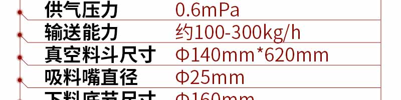 當(dāng)壓縮空氣供給真空發(fā)生器時,真空發(fā)生器就產(chǎn)生負壓形成真空氣流,物料被吸入吸料咀,形成物氣流,經(jīng)過吸料管到達上料機的料倉內(nèi)。過濾器把物料與空氣分離,當(dāng)物料裝滿料倉時,控制器會自動切斷氣源,真空發(fā)生器停止工作,同時料倉門自動開啟,物料落到設(shè)備的料斗中。與此同時,壓縮空氣通過脈沖反吹閥自動清洗過濾器。等到時間到或料位傳感器發(fā)出上料信號時,自動啟動上料機。