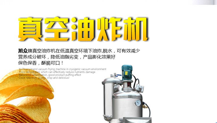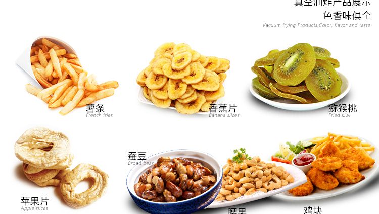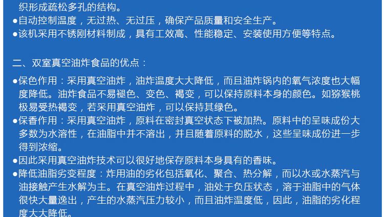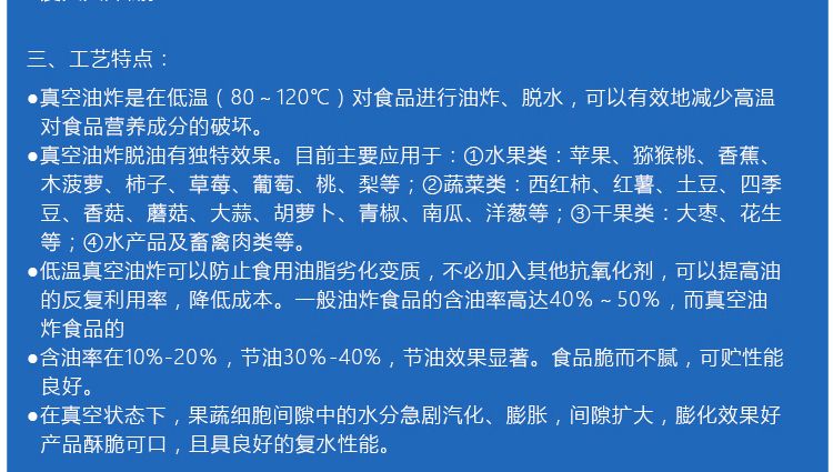 ●真空油炸是在低溫(80~120℃)對食品進(jìn)行油炸、脫水,可以有效地降低高溫對食品營養(yǎng)成分的破壞。